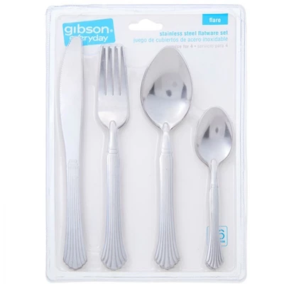 - This product is a 16-piece Gibson Stainless Steel Flatware set, perfect for everyday use or special occasions. The set includes 4 each of dinner forks, dinner knives, dinner spoons, and teaspoons, providing a complete dining experience for four people.