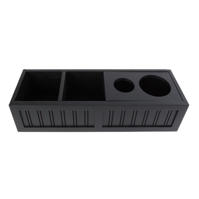Add specialized storage to your bathroom with this Beauty Wall Shelf with Towel Bar. The floating shelf has built-in storage on top, two 4″ sq. compartments, as well as circular openings for holding your hair dryer, flat iron or a brush. A towel bar hangs beneath