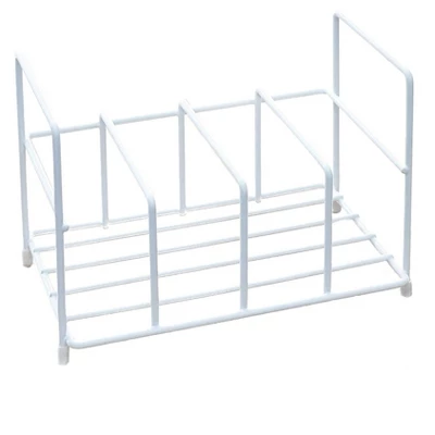 This cabinet lid organizer eliminates the clutter in the cabinet or drawer that holds your food storage containers and lids. The wire organizer has 4 slots with a back guard rail to neatly hold your food container lids vertically. Cut down on food prep time as you search for a matching lid. They will all be in full view for you and your kitchen will never feel more organized. Metal and polyethylene. 9-3/8″W x 6-1/4″D x 5-1/2″H
