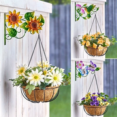 Add a pop of color to your outdoor decor with this Decorative Hanging Planter. Its hanger is decorated with colorful flowers and garden critters. It holds a metal basket with a coir liner in which you plant your flowers. Comes with a bracket to affix it to a wall or fence.