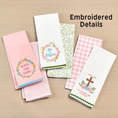 Add a touch of inspiration to your kitchen with our Embroidered Kitchen Towels Religious Set of 2. These charming towels feature uplifting messages that will infuse your culinary space with hope and faith. One towel in each set has a faith-based embroidered message, while the other features an all-over print. Select from All Things Are Possible, He is Risen, and Bless This Home. Crafted to be both decorative and practical, these towels make an excellent addition to any Easter gathering or daily kitchen use. Their cheerful designs and heartfelt messages serve as a daily reminder of what truly matters, all while keeping your kitchen stylish and functional. Perfect for gifting or adding a touch of sentiment to your own home, these towels offer a delightful blend of beauty and utility. With their eye-catching designs and positive affirmations, they promise to be conversation starters and mood lifters. Brighten up your kitchen with these lovely towels and celebrate the joy of the season.Key Features:DECORATIVE TOWELS: Feature inspirational messages to uplift and inspire. SEASONAL DESIGN: Colorful patterns perfect for spring and Easter celebrations. ELEGANT EMBROIDERY: Includes beautifully embroidered details for added charm. VERSATILE USE: Adds warmth and style to any kitchen decor. PERFECT FOR GIFTING: Makes a thoughtful present or a personal addition to your home. Made of: Cotton Measurements: 16″W x 26″L, each Care instructions: Machine care Notes: