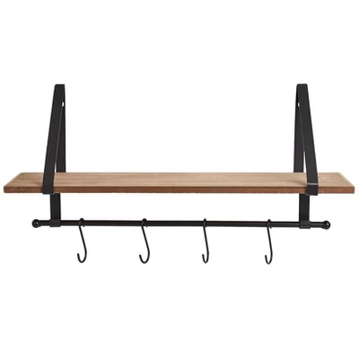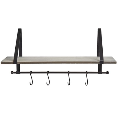 - The Wall Shelf with Hooks provides convenient storage and organization, measuring 18-1/2″ wide x 5″ deep x 9-1/2″ high, crafted from iron and MDF.