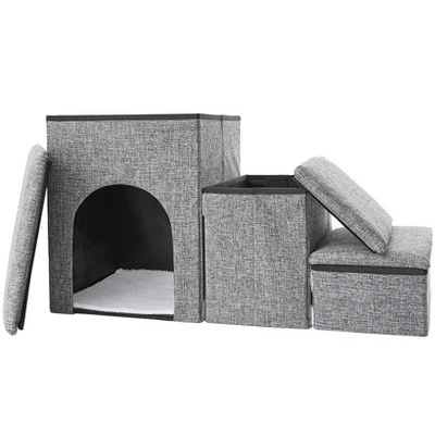 Pet Stairs with Storage enhances your furry friend s mobility while adding a stylish touch to your home. Whether you need pet steps for your bed, your couch, or for car travel, these versatile stairs cater to all your needs. Designed not just as steps but also as a cozy pet condo, it offers your pet a comfortable retreat. The detachable stairs feature removable lids, with the first two steps doubling as convenient storage boxes for toys, pet food, or other supplies. The larger step serves as a cozy nook with an entryway and cushioned floor, providing a cozy resting place for your pet. The sturdy platform ensures easy access to high beds or couches, so they can cuddle up without bothering achy paws and joints. Ideal for puppies, kittens, elderly cats, and senior dogs, these stairs are thoughtfully crafted to reduce joint pressure. With a modern aesthetic and neutral gray color, they seamlessly blend into any home decor. Lightweight and portable, they allow for effortless folding and transportation, making them the perfect companion for all your pet s adventures. Key Features: DETACHABLE STAIRS WITH STORAGE: Removable lids provide convenient storage for toys, treats, or other pet essentials. PET HOUSE WITH CUSHIONED FLOOR: Features a larger step that doubles as a cozy retreat for your pet to rest comfortably. NON-SLIP BOTTOM FOR SAFETY: Ensures stability and prevents slipping, keeping your pet secure while using the steps. LIGHTWEIGHT AND PORTABLE DESIGN: Effortlessly fold and transport the stairs for use at home or on the go. NEUTRAL GRAY TO MATCH YOUR DECOR: A stylish and versatile color that complements any home interior. Made of: MDF and polyester Measurements: 30″W x 13.75″D x 16.50″H Notes: Easy assembly required