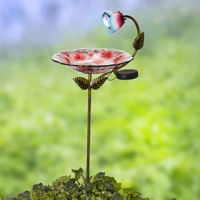Glass Birdbath with Metal Stake is a beautiful design that looks lovely day and night. Decorated with pink blooms, the birdbath sits atop a sturdy stake. A vine with a solar light hidden in a flower arches over the bowl, providing a glow after dusk. Made of: Glass, metal and polyester Measurements: 11″W x 13″D x 40″H