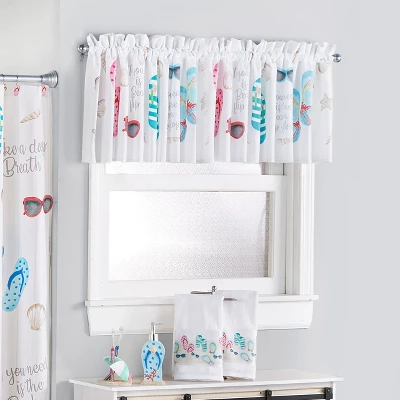 Give your bathroom a summertime vibe with this Gone to the Beach Bath Collection. The collection includes a Shower Curtain, Set of 12 Shower Hooks, Bath Rug, Set of 2 Hand Towels, Window Valance with rod pocket, Toothbrush Holder and Soap/Lotion Pump. Shower Curtain 72″ sq. Polyester Machine care Imported Set of 12 Shower Hooks 2″W x 2-3/4″L, each Cold cast ceramic and metal Bath Rug 20″ x 30″ Polyester with nonslip latex backing Machine care Imported Set of 2 Hand Towels 15″ x 25″, each Cotton and polyester Machine care Imported Window Valance 60″W x 18″L Polyester Machine care Imported Toothbrush Holder 4-1/8″W x 3-5/8″D x 5″H Cold cast ceramic Soap/Lotion Pump 3-1/4″W x 2-3/4″D x 8-1/4″H Cold cast ceramic