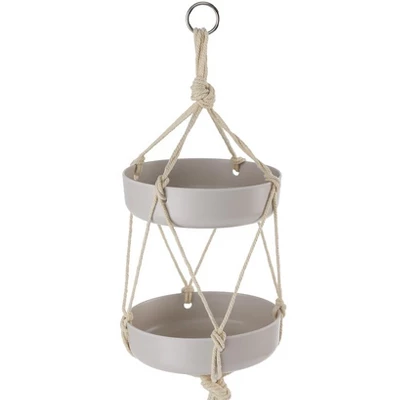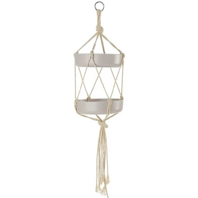 Double-tiered Macrame Bird Feeder and Waterer is a full-service stop for your feathered friends! The upper-level tray holds refreshing water while the and lower-level food tray provides food. The lower tray has drainage holes to help keep the birdseed fresh. With birds perching on the trays themselves, it’s like having a ringside seat to your own wildlife show’don’t forget to grab your camera! The feeder hangs effortlessly from a strong metal loop, making setup a breeze. Whether you’re a seasoned bird watcher or just beginning your birding adventure, this feeder is perfect for creating a welcoming haven for your feathered friends. Made of: Cotton and plastic Measurements: 6-1/2″ dia. x 24″H