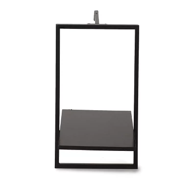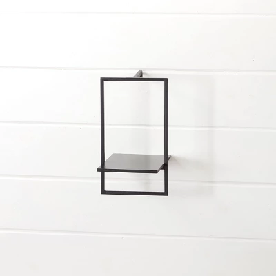 Contemporary-style wall shelf extends out from the frame for a 3-D look. Use this floating shelf to display collectibles, framed photos and other decoration items. This display shelf can also be used to hold potted plants or books. Assembly required; assembly hardware included. 8″W x 10″D x 13-3/4″H. MDF and metal.