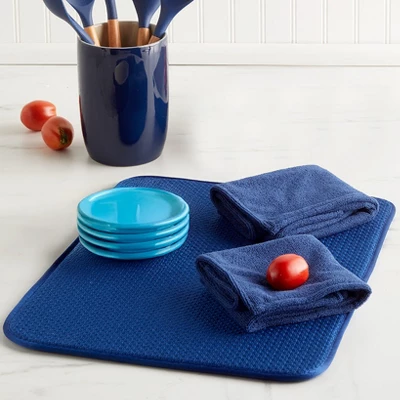 - Navy Drying Mat: Features a practical drying mat measuring 20″W x 15-1/2″L.