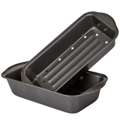 Nonstick Meatloaf Pan with Drain Tray makes enjoying comfort food healthier and easier than ever. This two-piece set is designed with a perforated insert that lets grease drain effortlessly while cooking, reducing unnecessary fat from your meatloaf. This clever design collects fat in the bottom nonstick tray for quick disposal and hassle-free cleanup. Perfect for whipping up everything from traditional meatloaf to quick favorites like banana or zucchini bread, this pan is a multi-tasker in the kitchen. The nonstick surface ensures your creations release easily every time, so you can spend more time enjoying your meal and less time cleaning up. Its functional design and versatility will quickly make it a go-to in your kitchen for baking and healthier eating. And when the meal is done, just place it in the dishwasher for ultimate ease. Create hearty, satisfying dishes without the fuss, and take a step towards healthier eating with this must-have kitchen tool! Key Features: TWO-PIECE DESIGN: Comes with a perforated top tray to drain fat while cooking for healthier results. MULTI-PURPOSE FUNCTIONALITY: Perfect for classic meatloaf, quick breads like banana and zucchini, and so much more! EFFORTLESS RELEASE NONSTICK SURFACE: Nonstick coating ensures easy removal of baked goods every time, no sticky mess. EASY CLEANUP FOR YOUR CONVENIENCE: Dishwasher safe, saving time and effort after enjoying your delicious creations. SIZED FOR EVERYDAY USE: Ideal size for family meals, combining practicality with ease of use. Made of: Carbon steel Measurements: Outer pan, 11.50″W x 5.75″D x 2.75″H Inner pan, 9.50″W x 5″D x 1.50″H Notes: Dishwasher safe