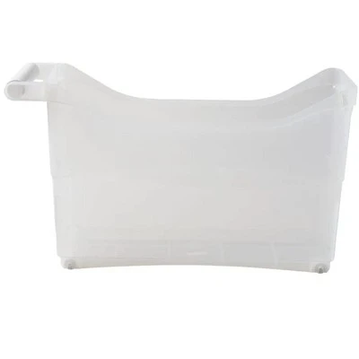 Keep your kitchen, bathroom, or garage shelves organized with this wheeled storage bin that handles on either side for easy access. Rolling wheels on the bottom make it easy to slide in and out of cabinet spaces. The handle on the end of it gives you an extra spot to grip on and safely life or shift the bin around. Organize your cabinets, pantry, closets and more. Polypropylene. 6″W x 18-1/4″D x 10-1/2″H