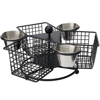 The Rotatable Basket with Dipping Cup is your ultimate party companion, designed to bring fun and convenience to any gathering. With three baskets and three dip cups, you can serve a variety of foods and dips all at once, making it perfect for hosting family events, dinners or just everyday use at home. Serve crispy fries, onion rings and vegetable sticks, each paired with your favorite sauces like ketchup, mustard and aioli, all beautifully presented in this rotating setup. Made of: Metal Measurements: 10 1/4″ dia. x 5″H Notes: Hand wash only