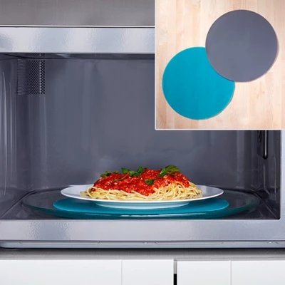 Discover the versatility with this set of 2 silicone mats in multiple ways around the kitchen. They can be placemats, bowl covers or hot pads. You can also use them to protect your hands from heat while cooking. Nonstick and nonskid. Made from: Silicone Measurements: 11-3/4″ dia. Set includes: – 1 Turquoise mat – 1 Gray mat Notes: Microwave safe