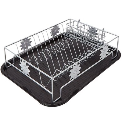 Constructed from durable, rust-resistant metal, the dish rack is built to last while maintaining its aesthetic appeal. The black and silver color scheme ensures it complements various kitchen decors seamlessly. A black drip tray is positioned underneath the rack to catch water, preventing spillage onto the countertop and keeping the kitchen area clean. Additionally, the dish rack is equipped with non-slip feet, ensuring it stays securely in place on the countertop. Its compact dimensions make it suitable for standard kitchen spaces, offering ample storage without taking up too much room. The overall design is both elegant and highly functional, making it a stylish and practical addition to any kitchen.