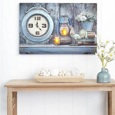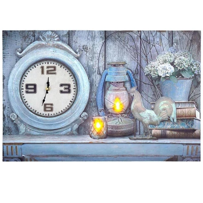 A uniqe accent, a Themed Lighted Wall Clock is a timepiece and decor in one. Warm white LEDs bring the detailed artwork to life. Decorative clock will keep you on time every day. It is the perfect addition to your themed interior. Made of: MDF, canvas and polypropylene Measurements: 23-1/2″W x 15-3/4″L Notes: Requires 2 “AA” batteries