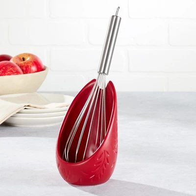 Upright Spoon Rest is a decorative way to keep your counters neat. Vertical design keeps the spoon from dripping on the stovetop while you work. A notch in the top keeps a spoons, spatuals, ladles and more in place. Embossed floral design gives it a lovely touch. Made of: Earthenware Measurements: 4″ dia. x 6-2/3″H