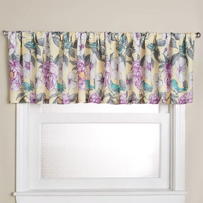 Totally coordinate your bathroom with this Valentina Bath Collection. It features butterflies, blue birds and flowers on a pale yellow background. Hang the Shower Curtain with the Set of 12 Hooks, shaped like butterflies. Lay the Bath Rug in front of the tub. The 100% cotton Set of 2 Hand Towels each feature an embroidered butterfly and flower. Trim the window with the Valance.