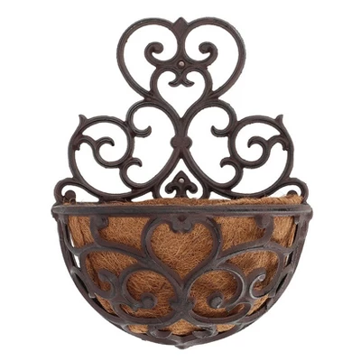 Heart-themed scrollwork gives this Victorian Half-Round Wall Planter with Liner extra charm. Use it indoors or outside to feature a special plant. It’s especially suitable for vining and trailing plants. Made of: Cast iron and coconut fibers Measurements: 11-1/2″W x 6-1/2″D x 14-1/2″H