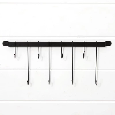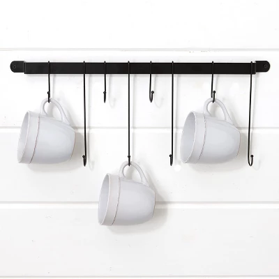 Free up cabinet space with the use of this wall-mounted coffee mug holder. The simple design of this mug organizer works with almost any style of kitchen decor–even yours. The coffee mug rack holds up to 8 mugs in a high/low arrangement of hooks to save space. Assembly is required for this coffee cup holder and the assembly hardware is included. Includes: Bar, 1″ dia. x 22″L. 4 Short hooks, 1/4″W x 1-1/2″D x 3-1/2″H, each. 4 Long hooks, 1/4″W x 1-1/2″D x 9″H, each. Metal.